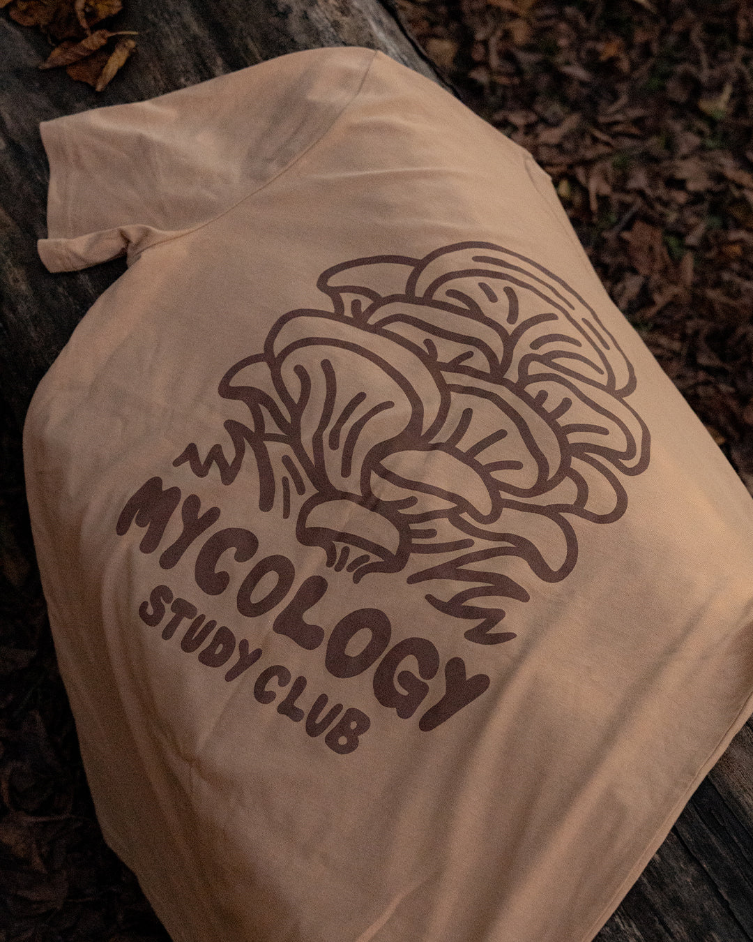 - Hand illustrated large back print of mushrooms and 'Mycology Study Club' logo below.